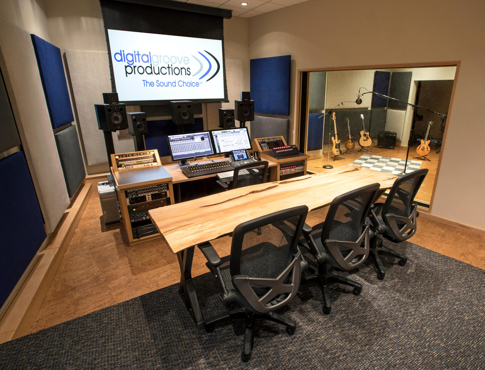 Digital Groove's 2 large control rooms can easily accomodate 6-10 people comfortably. Both of our Russ Berger designed suites have large video projection, multi-channel monitoring and large windows to the studios for clear sight lines and pristine audio, so everyone can help craft the perfect take and the ultimate mix.