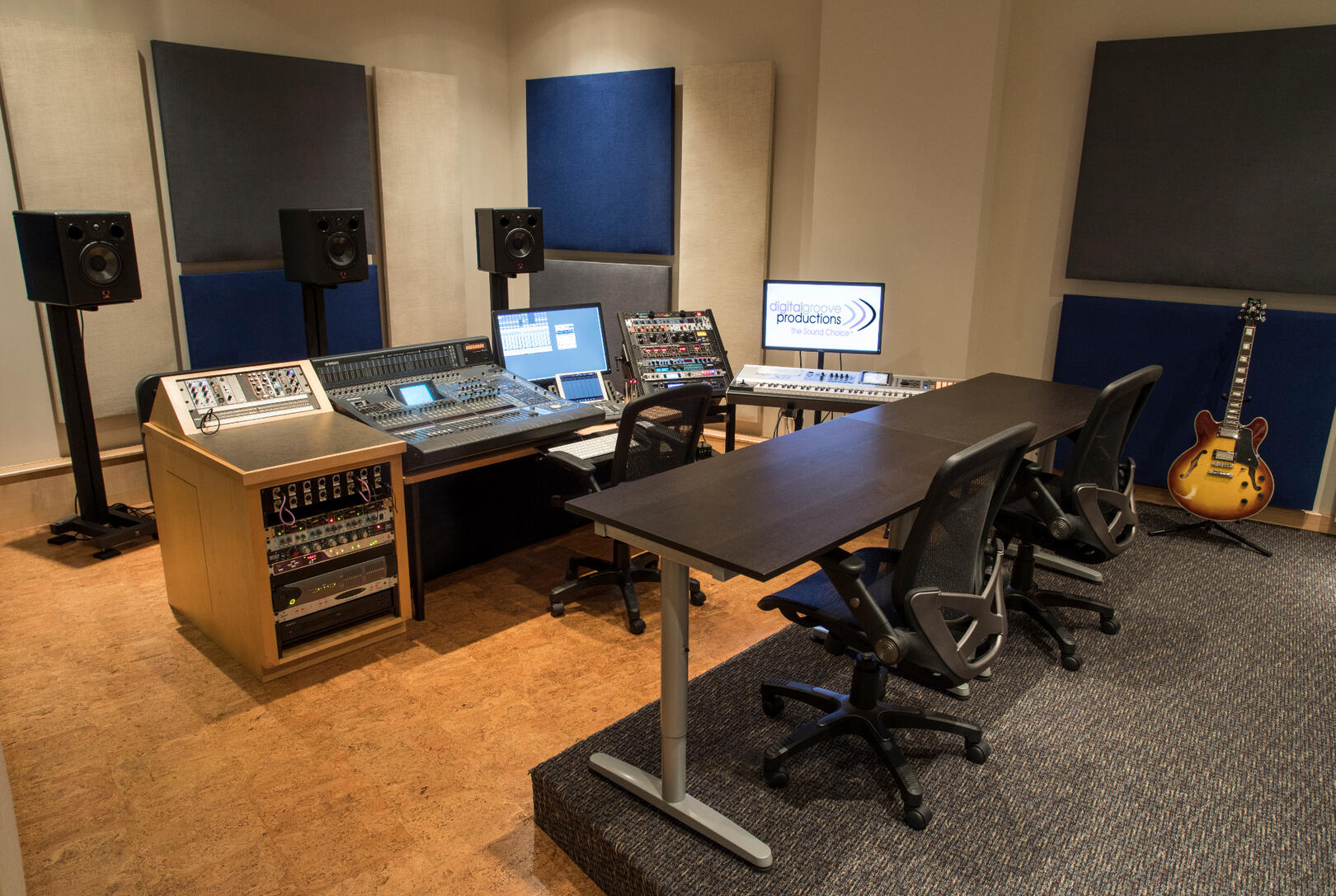 Digital Groove's 2 large control rooms can easily accomodate 6-10 people comfortably. Both of our Russ Berger designed suites have large video projection, multi-channel monitoring and large windows to the studios for clear sight lines and pristine audio, so everyone can help craft the perfect take and the ultimate mix.